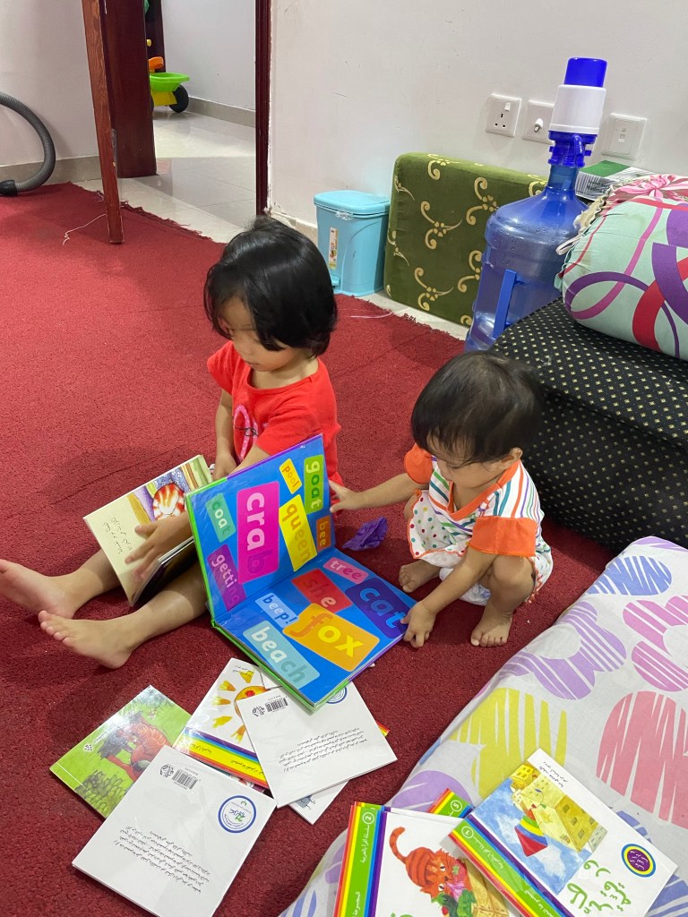 We have been doing the one parent one language method. Though it helps a lot, it occurs to me that my daughter’s vocabulary is not expanding as much as we hope. Also, she had been trying to avoid using Arabic language whenever my husband speaks to her. Which I think is because of her lack of confidence and maybe she sees how both of her parents communicating to each other in Malay. So she came to a conclusion “oh I am going to speak in Malay/English too since that is what I heard mostly in this house”