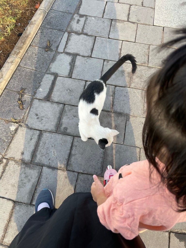 Maryam trying to skate and feed the cat at the same time
