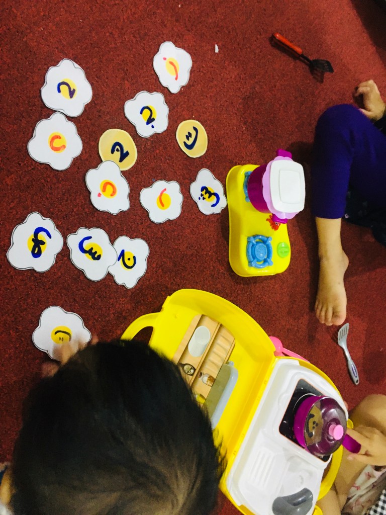 My girls love to play cooking, they can go on for hours. So I searched some clip arts from google , printed and laminated them and wrote the hijaiyyah hurufs. So we role-played making some hijaiyyah pancakes and eggs! also not in picture : some cookies clip art that I printed too- the children learnt arabic numbers by counting the cookies and baking them!
