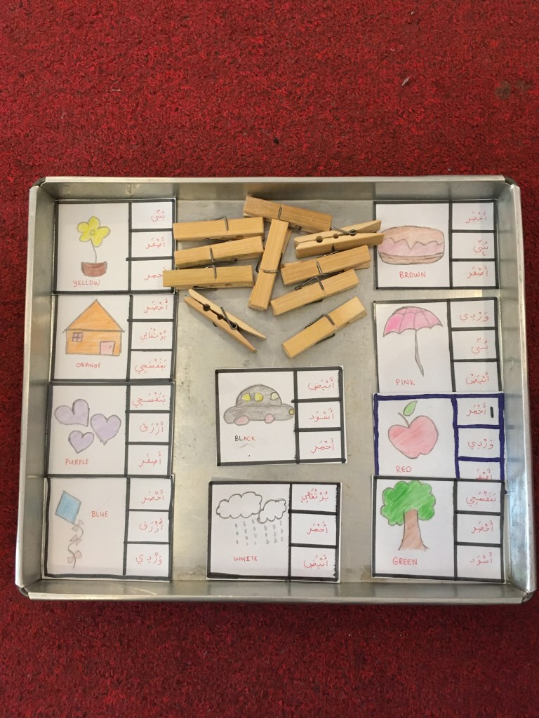 I made a clip cards for Maryam to learn arabic. Besides learning about colours, she is practicing her pincer grasp by using the pegs (Pincer grasp is important for writing – read more on this here )